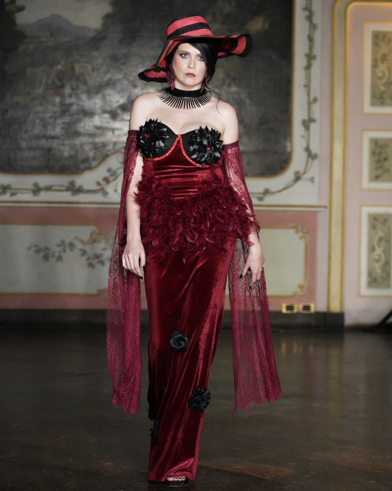 House of Rina unveiled Le Donne Di Rosso, a tribute to women everywhere — honoring their courage, resilience, and transformative power. More than a presentation of garments, the show unfolded as an emotional journey, capturing the layered nature of modern womanhood, where softness and strength exist in perfect harmony. A deliberate dialogue between shadow and fire defined the palette: deep black lace, chiffon, satin, and velvet spoke of untold stories and inner fortitude shaped by experience, while silhouettes in defiant red charmeuse, organza, georgette, and fluid silk emerged as a collective voice of visibility and solidarity. The red pulsed with life and purpose, symbolizing courage and the unbreakable bond between women who rise together. Subtle crystal and pearl embellishments highlighted the precision of couture craftsmanship, as the contrast between structured velvet and weightless chiffon mirrored vulnerability and power coexisting within a single, commanding vision.