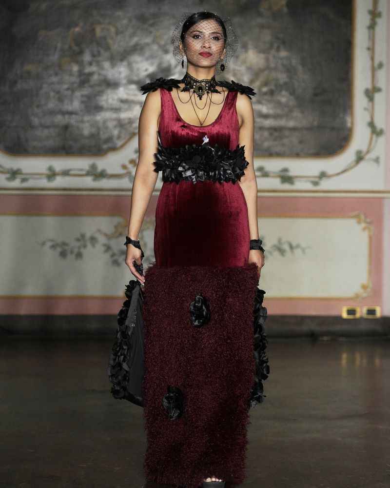 Paroma-Àla-Mode, founded by Paromita Ghosh, delivered a deeply personal couture statement where heritage, femininity, and theatrical elegance converged. Working in a dramatic palette of bordo and black, the collection unfolded through sculpted velvet silhouettes, fluid draping, and intricate surface embellishments that balanced sensuality with strength. Statement hats, corseted structures, and layered textures introduced a sense of modern vintage glamour.