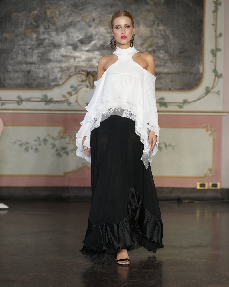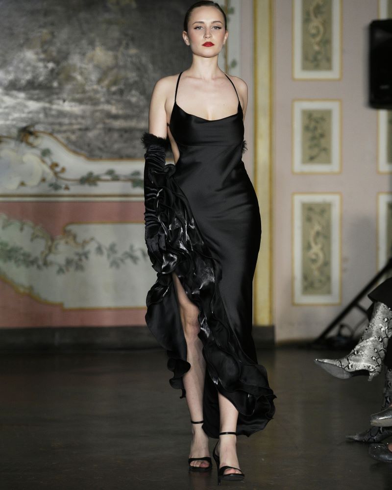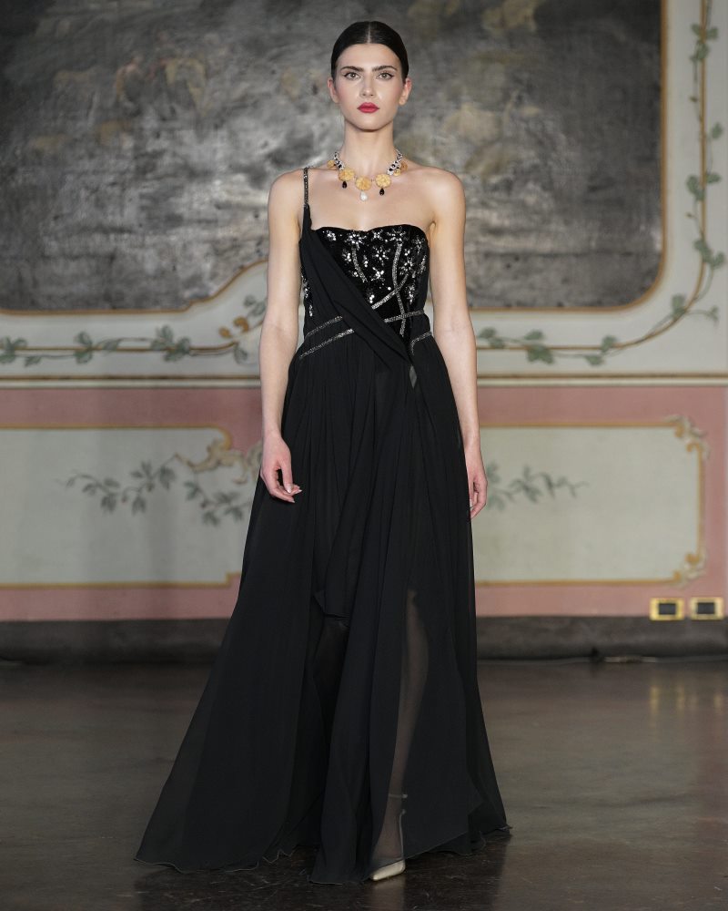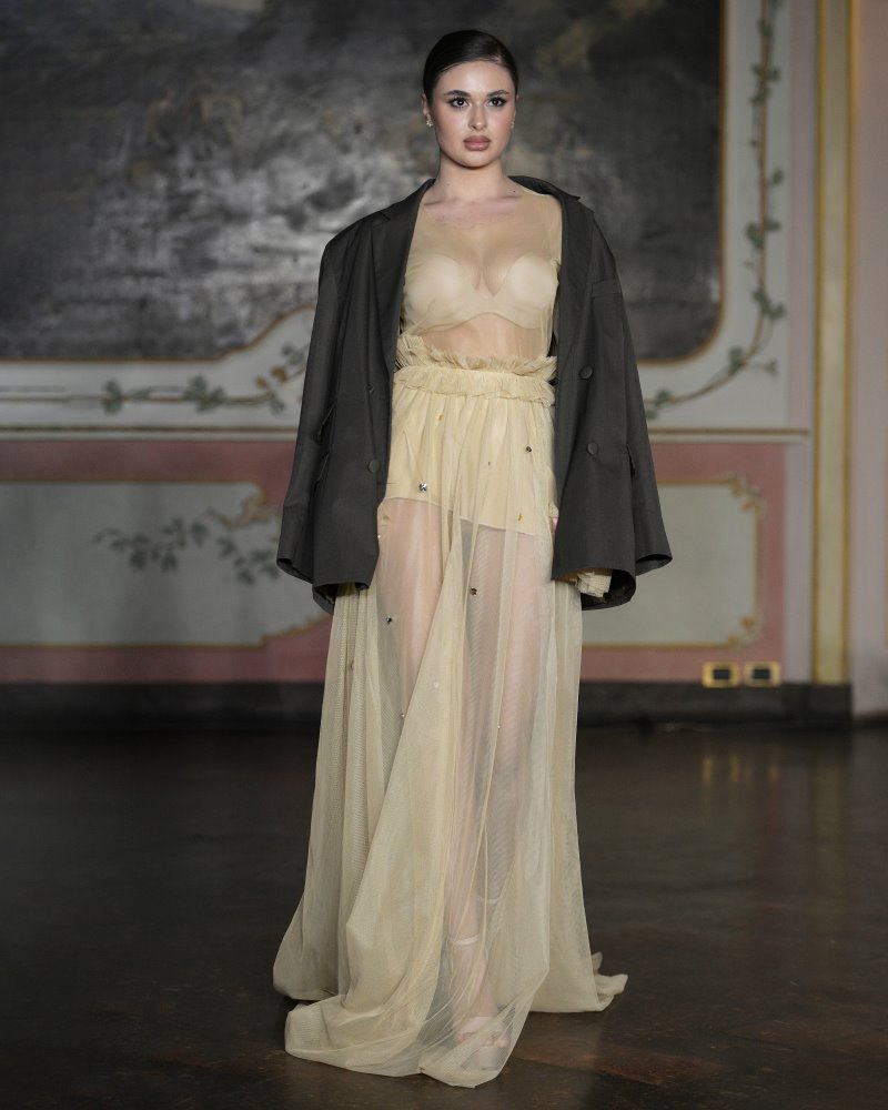 Ia Goniadze presented a vision of modern couture rooted in the philosophy of exclusivity and timeless refinement. A refined palette of muted gold and black framed the collection, while corseted waists, architectural ruffles, and sheer, weightless layers created a dialogue between structure and fluidity. Handcrafted textiles and meticulously constructed silhouettes highlighted the house’s devotion to individuality — each look existing as a singular work rather than a repeatable design. Balancing classic elegance with a distinctly modern edge, the collection embodied a quiet, confident luxury, reaffirming Ia Goniadze’s long-standing philosophy that true couture begins where uniqueness becomes absolute.
