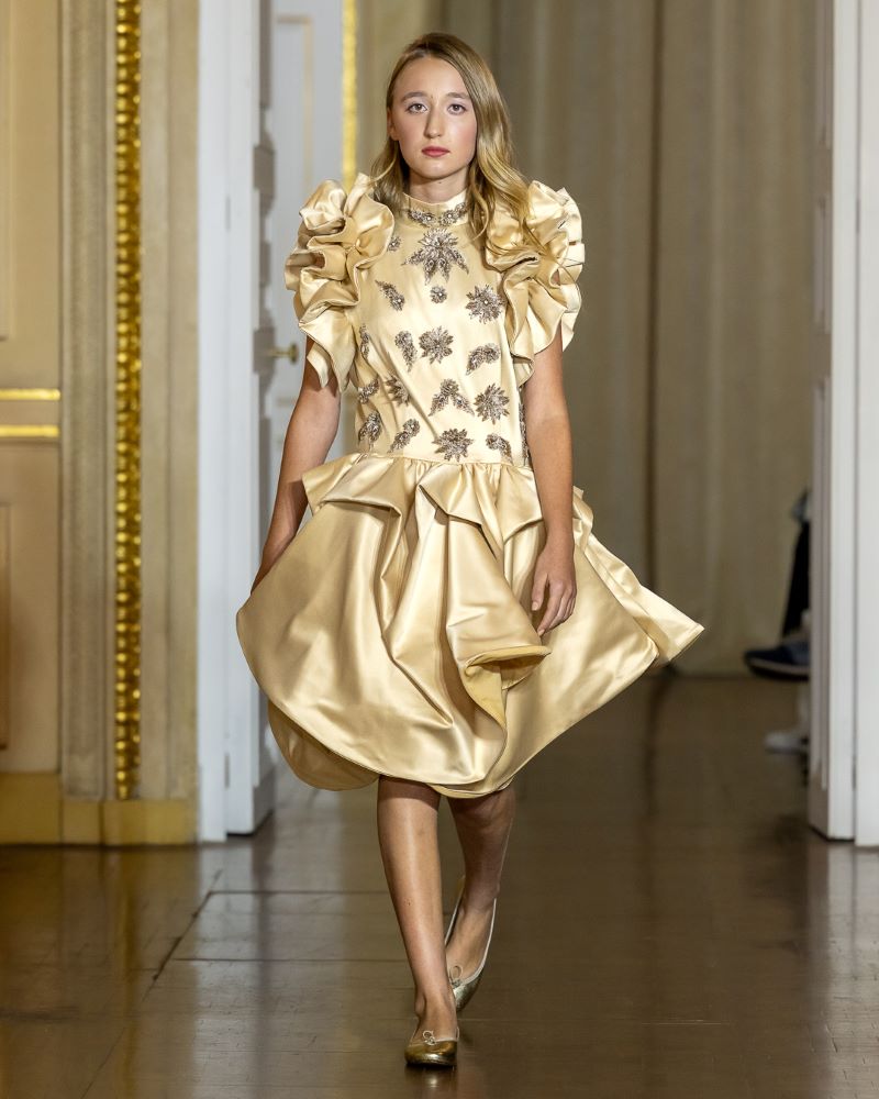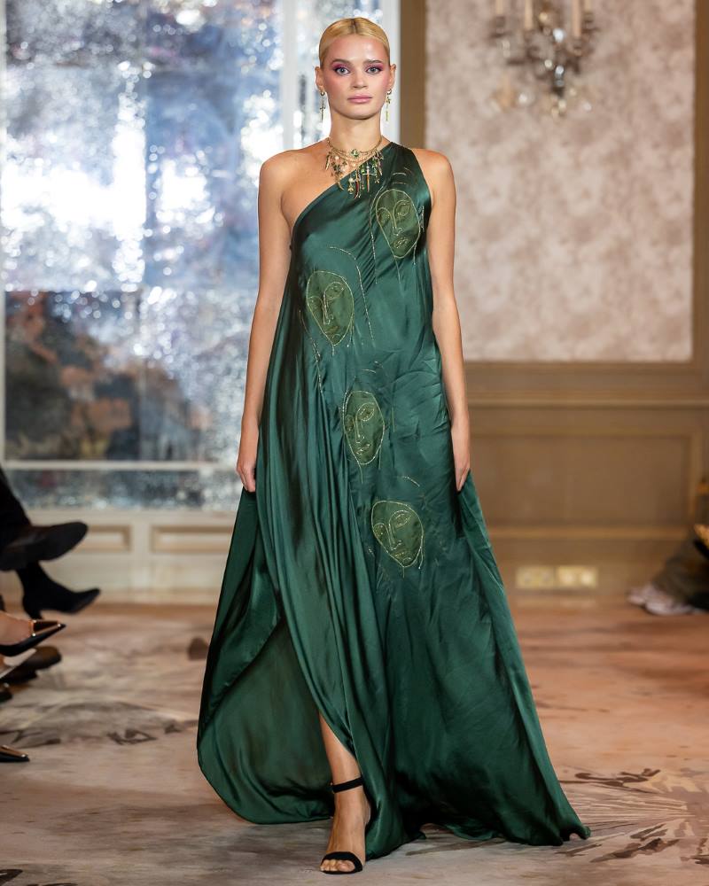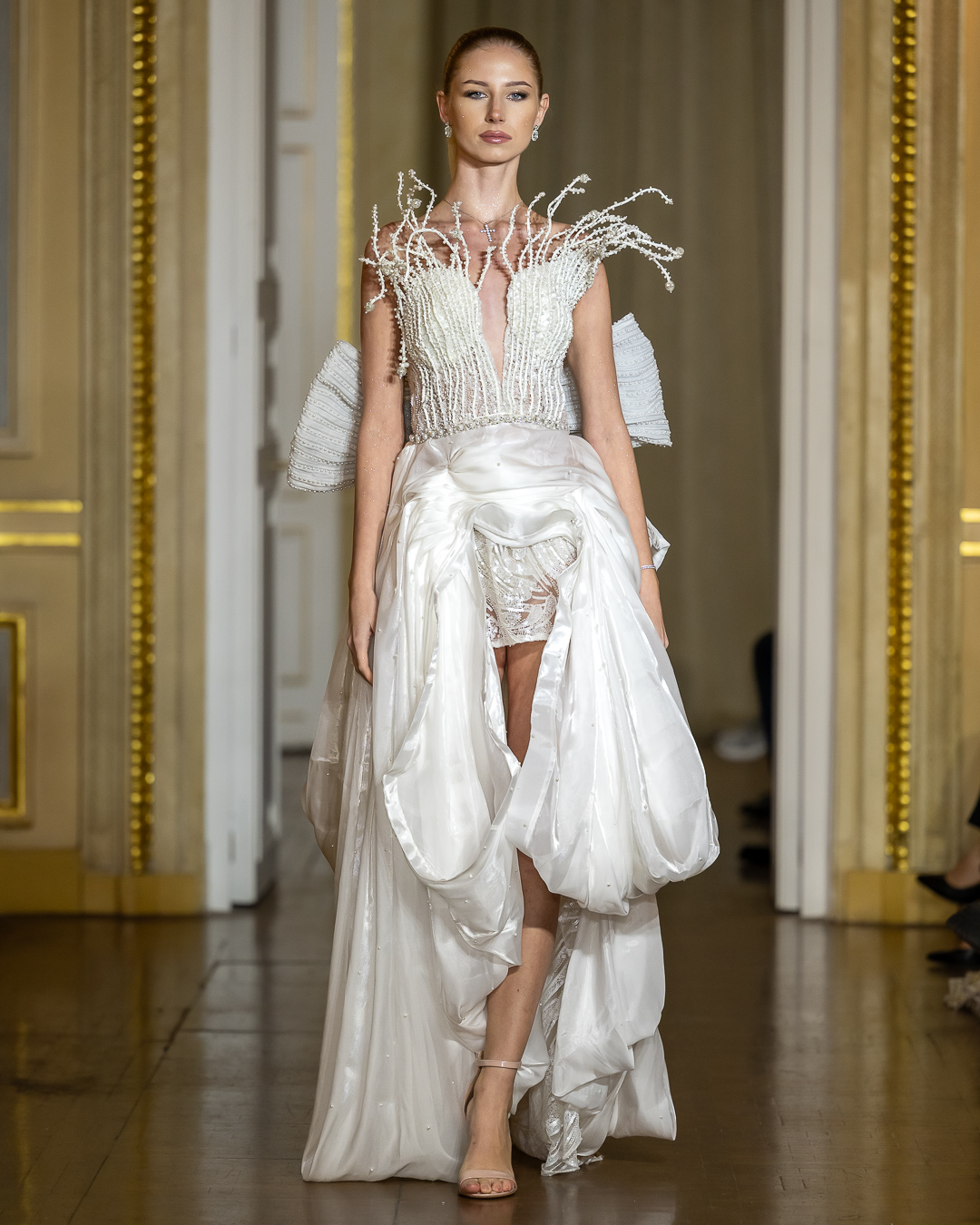 Keti Chkhikvadze, designer of MAISON KETI, unveiled a striking collection defined by sculptural silhouettes, cascading movement, and a celebration of unapologetic femininity. Signature to her style, the looks combined structured volume with fluid motion — from tiered ruffles in playful polka dots and vivid florals to romantic white ensembles crafted from sheer tulle and petal-like appliqués. Bold red and electric blue prints evoked joy and nostalgia, while black and white looks added a sense of timeless drama with hand-embroidered gold motifs and velvety textures. Each piece danced between tradition and fantasy, capturing the spirit of a woman who is powerful yet poetic, grounded in heritage yet unafraid to dream.
