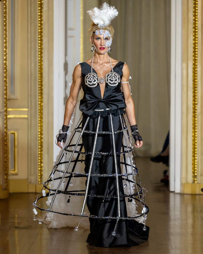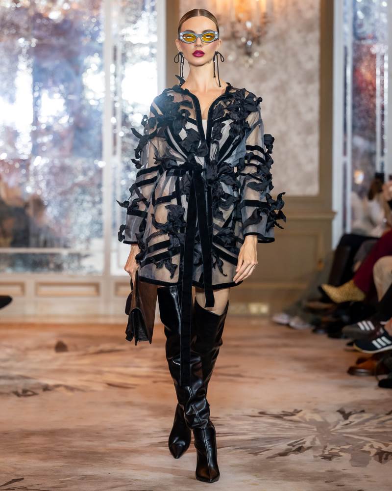 IRA LANGEVIN — the fashion house founded by designer, playwright, and diplomat Ira Langevin — presented her collection “She Who Knows.” It is not simply a collection — it is a manifesto. The collection presents a striking dialogue between softness and strength, where sculptural silhouettes meet fluid movement. Ethereal gowns in lavender gradients float like mist, crafted from delicately pleated fabrics that cascade around the body with weightless grace. Black-and-white geometric compositions add a graphic edge, while voluminous whites adorned with feather-like detailing introduce a sense of celestial purity. Built on duality, it contrasts architectural structure with fluid drapery, concealment with bold cuts — reminding us that true strength is not loud, but deeply felt.