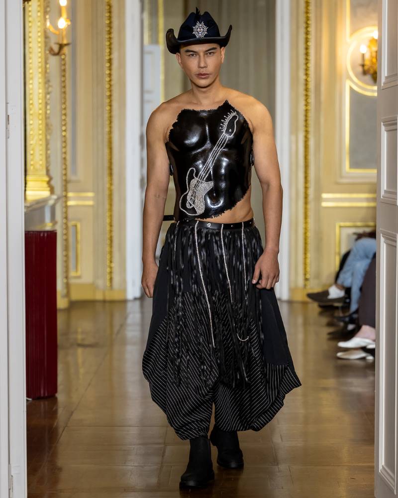 Kharchi’s collection stepped onto the Paris runway like a silent yet powerful hymn — draped in deep blacks, layered textures, and sculptural silhouettes that felt both ancestral and avant-garde. Quilted jackets, gathered skirts, veiled headpieces, and hand-stitched patchwork reimagined traditional Georgian elements with a contemporary, almost ceremonial aura. Every look felt like a poem of contrasts: raw yet refined, modest yet magnetic, grounded yet spiritual.